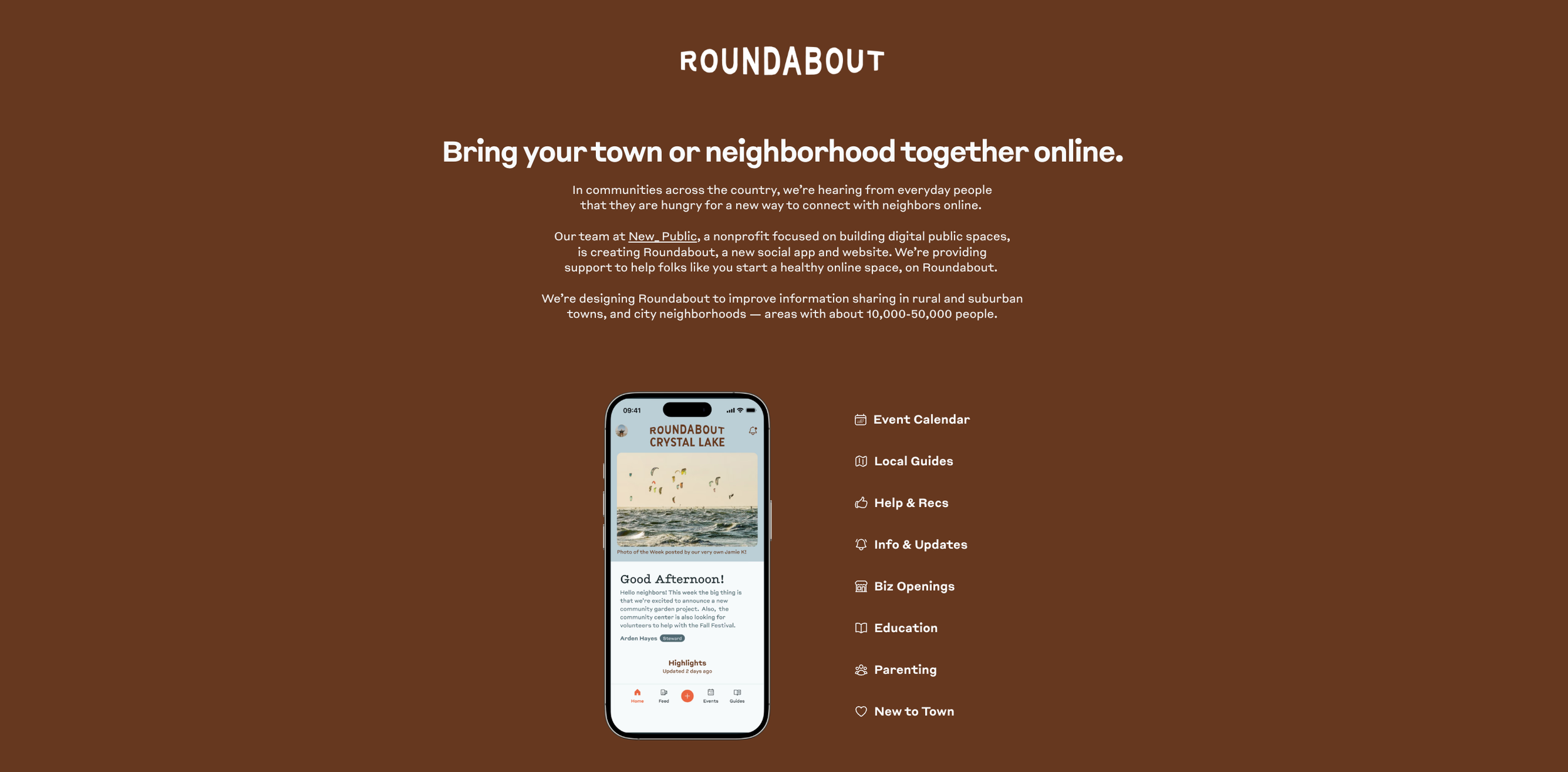 I shaped the product strategy for what would become Roundabout — a platform designed from the ground up to center stewardship, local relevance, and community care rather than engagement-driven dynamics. The platform was built around two core local use cases that our research had identified as the primary reasons people turn to local digital spaces: neighborly exchange and trusted local information. It was designed to support the community stewards who make these spaces work — with tools for norm-setting, safety moderation, and proactive facilitation — rather than treating moderation as an afterthought.