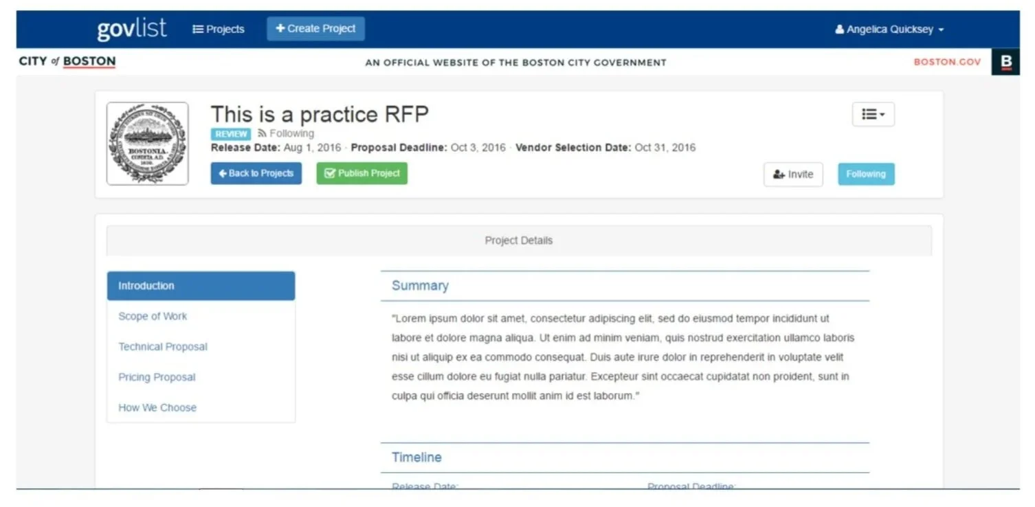 Over eight weeks, I conducted 17 interviews, reviewed procurement statutes at the city and state level, and mapped the full procurement process for RFPs over $35K — capturing both the internal city staff journey and the vendor journey. I evaluated and introduced new features for the RFP-writing tool Govlist, developed user stories with their engineering team, and shipped new features on a biweekly basis. I also created a web-based procurement guide for the city's new intranet and wrote a formal policy memo to the Mayor with recommendations for improvement.
